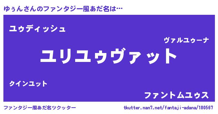 | 男性向けラノベタイトル風あだ名 | 『ユゥンスレイヤー』『魔弾の王とゆぅん』 |