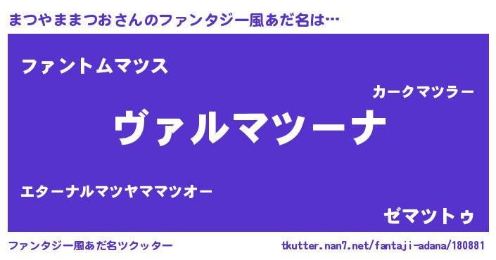 | 男性向けラノベタイトル風あだ名 | 『この素晴らしい世界にまつやままつおを!』 |