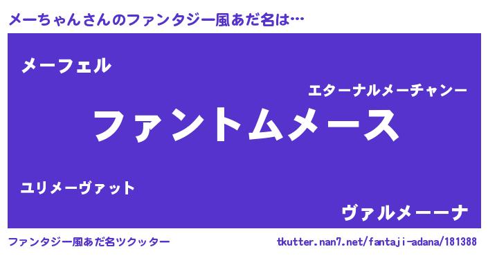 男性向けラノベタイトル風あだ名 | 『ダンジョンにメーちゃんを求めるのは間違っているだろうか』 |