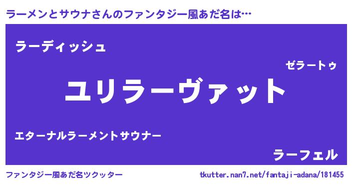 | 男性向けラノベタイトル風あだ名 | 『ラーメントサウナスレイヤー』 |