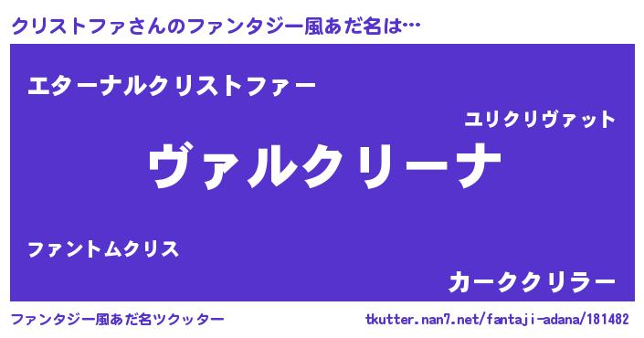 | 男性向けラノベタイトル風あだ名 | 『この素晴らしい世界にクリストファを!』 |