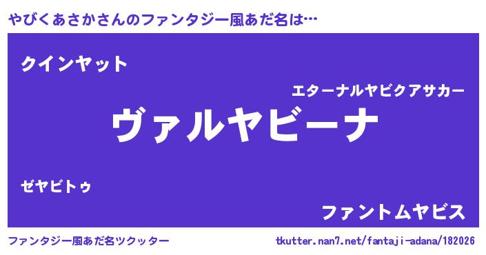 | 男性向けラノベタイトル風あだ名 | 『魔弾の王とやびくあさか』 |