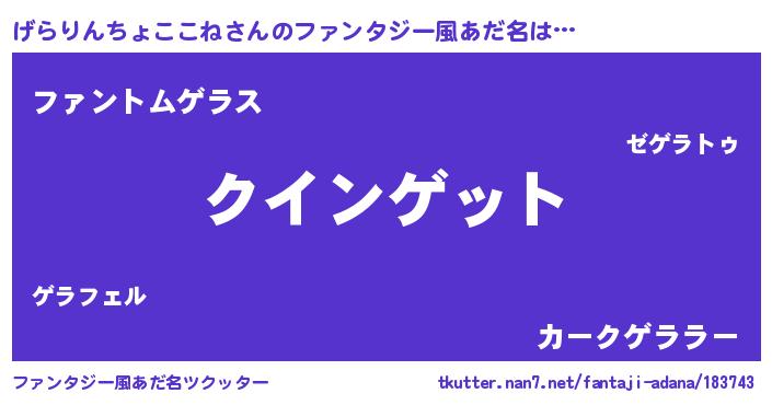 | 男性向けラノベタイトル風あだ名 | 『おまえをオタクにしてやるから、俺をげらりんちょここねにしてくれ! 』 |