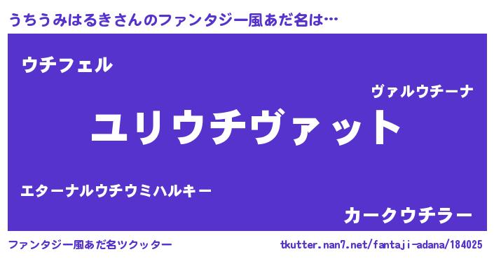 | 男性向けラノベタイトル風あだ名 | 『うちうみはるき~年齢イコール彼女いない歴の魔法使い~』 |
