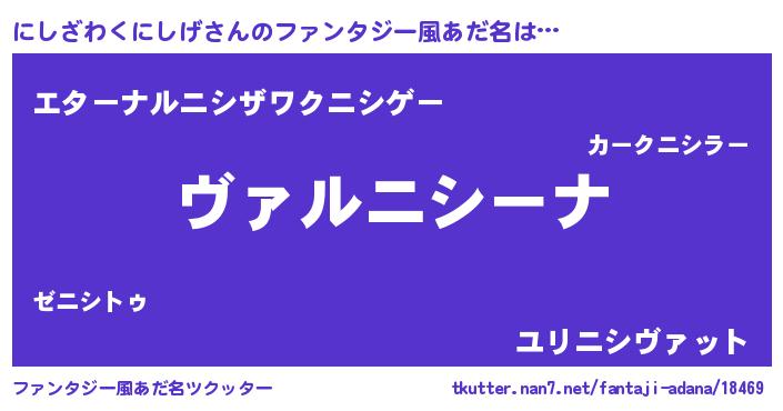 | 男性向けラノベタイトル風あだ名 | 『魔弾の王とにしざわくにしげ』 |