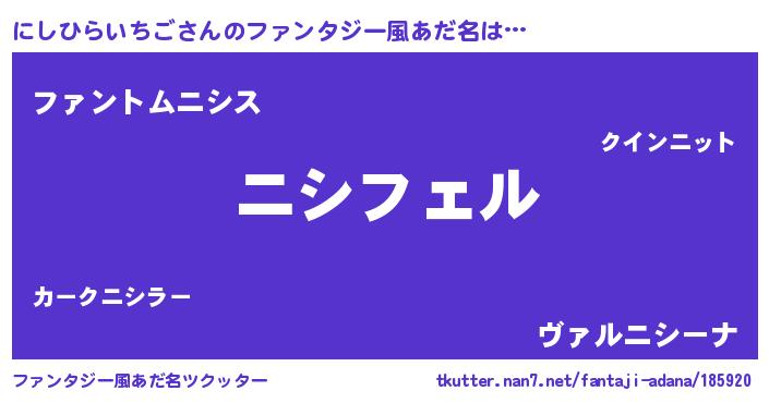 | 男性向けラノベタイトル風あだ名 | 『ニシヒライチゴアートオンライン』 |