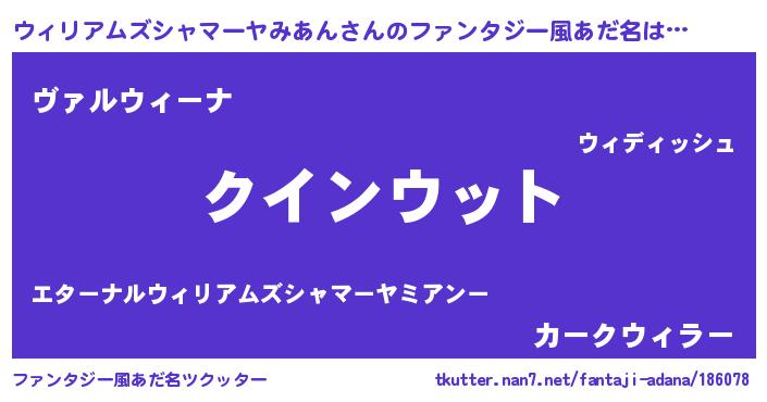 | 男性向けラノベタイトル風あだ名 | 『ノーゲーム・ノーウィリアムズシャマーヤミアン』 |