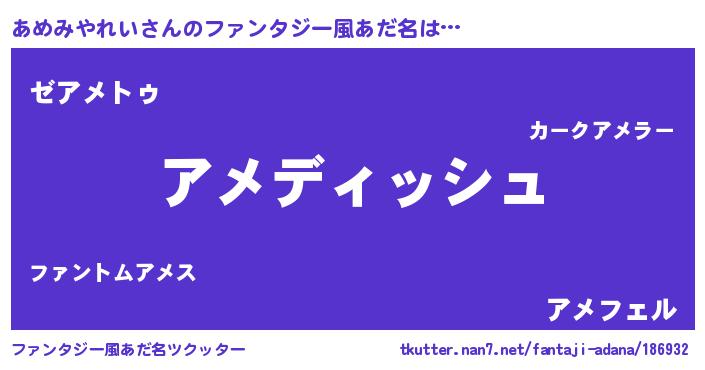 | ヒーロー風カッコイイあだ名 | 『ネオアメミヤレイ』『銀牙騎士アメ』 |