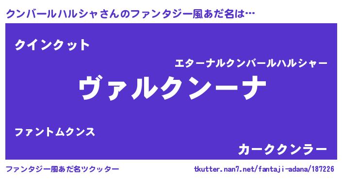 | 男性向けラノベタイトル風あだ名 | 『この素晴らしい世界にクンバールハルシャを!』 |