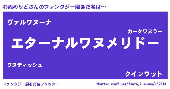 | 男性向けラノベタイトル風あだ名 | 『わぬめりどに滅ぼされるだけの簡単なお仕事です』 |