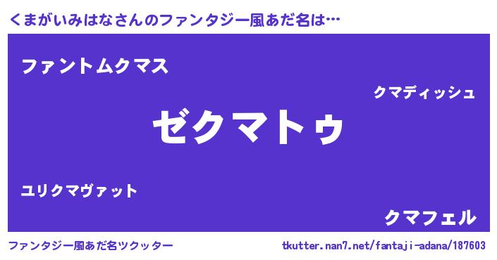| 欧米人風あだ名 | 『アンジェラ・くまがいみはな』 |