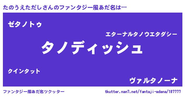 | 男性向けラノベタイトル風あだ名 | 『たのうえただしという概念が存在しない退屈な世界 』 |