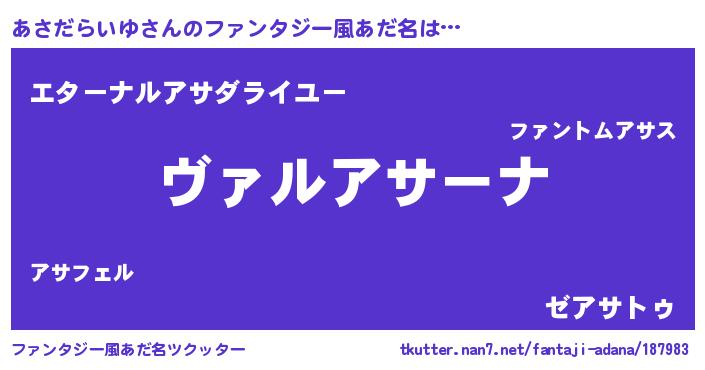 | 男性向けラノベタイトル風あだ名 | 『魔弾の王とあさだらいゆ』 |