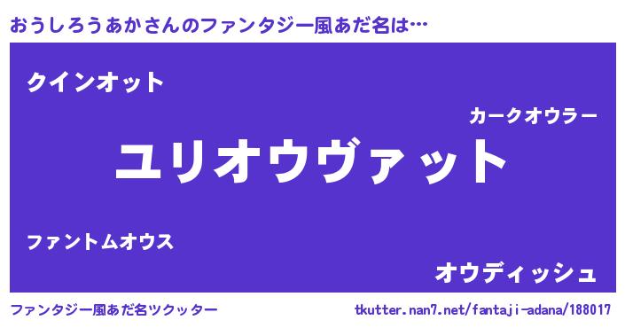 | 男性向けラノベタイトル風あだ名 | 『おうしろうあか~年齢イコール彼女いない歴の魔法使い~』 |