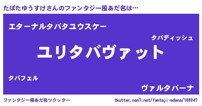 | 男性向けラノベタイトル風あだ名 | 『たばたゆうすけ~年齢イコール彼女いない歴の魔法使い~』 |