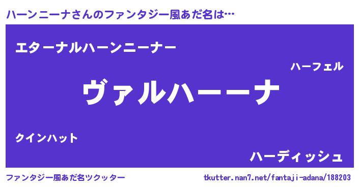| 男性向けラノベタイトル風あだ名 | 『この素晴らしい世界にハーンニーナを!』 |
