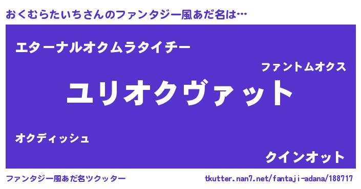 | 男性向けラノベタイトル風あだ名 | 『おくむらたいち~年齢イコール彼女いない歴の魔法使い~』 |
