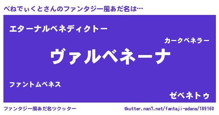 | 男性向けラノベタイトル風あだ名 | 『魔弾の王とべねでぃくと』 |