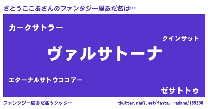 | 男性向けラノベタイトル風あだ名 | 『魔弾の王とさとうここあ』 |
