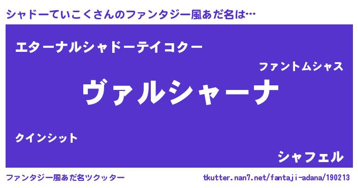 | 男性向けラノベタイトル風あだ名 | 『魔弾の王とシャドーていこく』 |