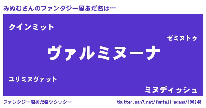 | 男性向けラノベタイトル風あだ名 | 『魔弾の王とみぬむ』 |
