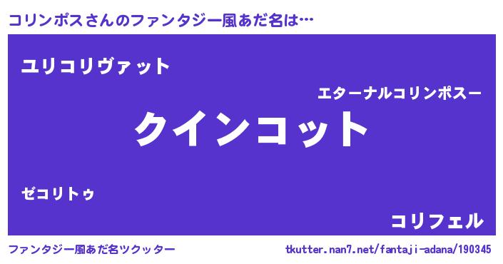 | 男性向けラノベタイトル風あだ名 | 『コリンポスに滅ぼされるだけの簡単なお仕事です』 |