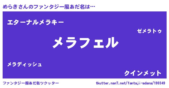 | 男性向けラノベタイトル風あだ名 | 『めらきに滅ぼされるだけの簡単なお仕事です』 |