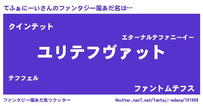 | 男性向けラノベタイトル風あだ名 | 『てふぁにーい~年齢イコール彼女いない歴の魔法使い~』 |