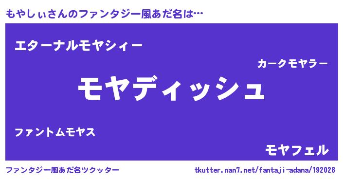 | 男性向けラノベタイトル風あだ名 | 『もやしぃという概念が存在しない退屈な世界 』 |