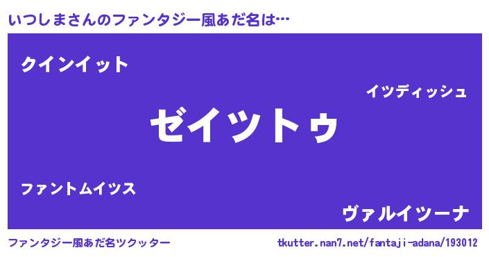 | 男性向けラノベタイトル風あだ名 | 『Re:いつしまから始める異世界生活』 |