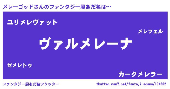| 男性向けラノベタイトル風あだ名 | 『魔弾の王とメレーゴッド』 |
