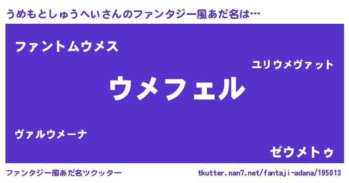 | 男性向けラノベタイトル風あだ名 | 『うめもとしゅうへいの憂鬱』 |