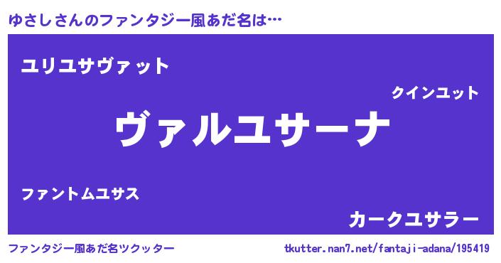 | 男性向けラノベタイトル風あだ名 | 『魔弾の王とゆさし』『ユサシスレイヤー』 |
