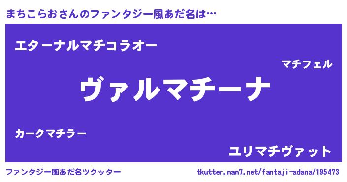 | 男性向けラノベタイトル風あだ名 | 『魔弾の王とまちこらお』 |