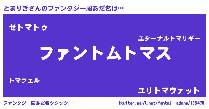 | 自動車の名前っぽいあだ名 | 『トルトマパン』『メルトマス・トンツ』 |