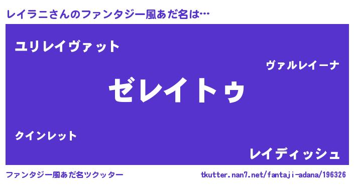 | 男性向けラノベタイトル風あだ名 | 『Re:レイラニから始める異世界生活』 |