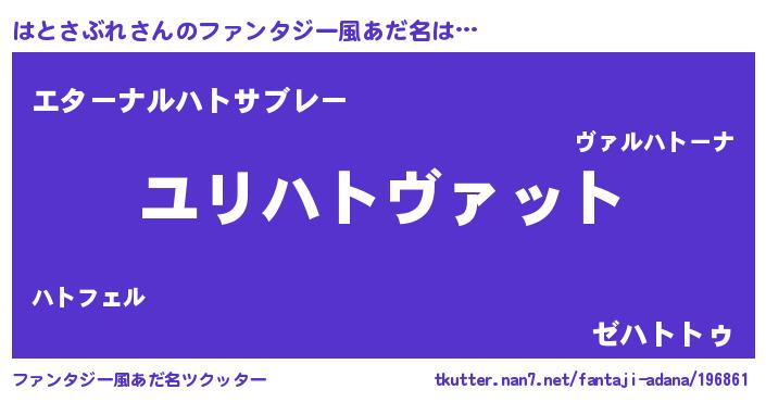 | 男性向けラノベタイトル風あだ名 | 『はとさぶれ~年齢イコール彼女いない歴の魔法使い~』 |