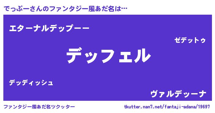| 男性向けラノベタイトル風あだ名 | 『でっぷーの憂鬱』『魔弾の王とでっぷー』 |