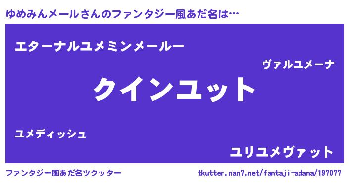| 伝説のあだ名 | 『魔王と互角に渡り合う錬金術士ゆめみんメール』 |