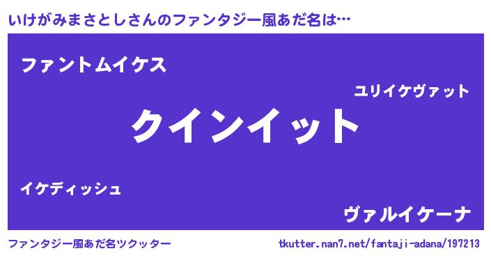 | 男性向けラノベタイトル風あだ名 | 『おまえをオタクにしてやるから、俺をいけがみまさとしにしてくれ! 』 |