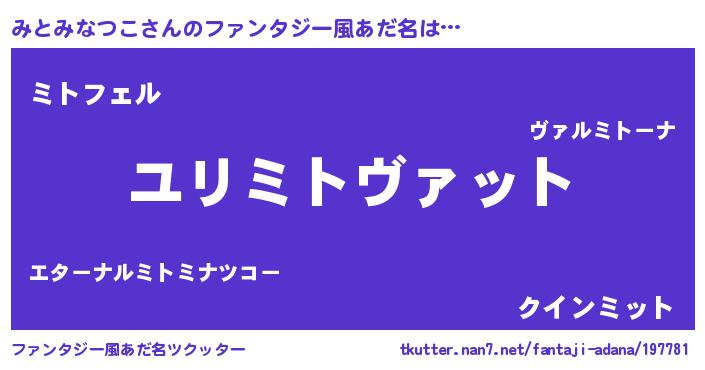 | 男性向けラノベタイトル風あだ名 | 『みとみなつこ~年齢イコール彼女いない歴の魔法使い~』 |