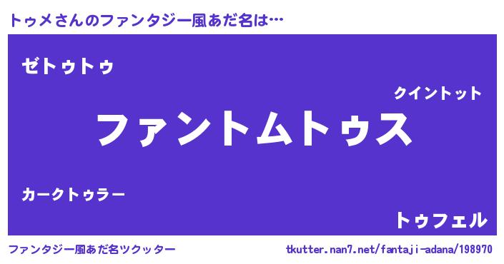| 男性向けラノベタイトル風あだ名 | 『トゥメの嫁は女の子じゃないと思った?』 |