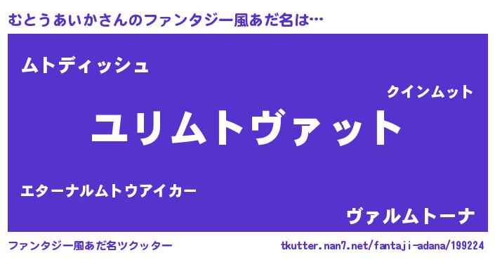 | 男性向けラノベタイトル風あだ名 | 『むとうあいか~年齢イコール彼女いない歴の魔法使い~』 |