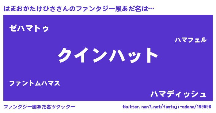 | 男性向けラノベタイトル風あだ名 | 『ノーゲーム・ノーハマオカタケヒサ』 |