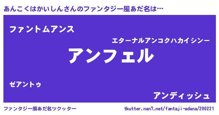 | 男性向けラノベタイトル風あだ名 | 『あんこくはかいしんに滅ぼされるだけの簡単なお仕事です』 |