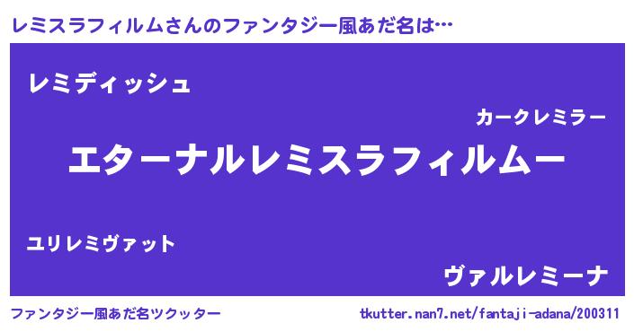 | 意味不明あだ名 | 『レミスラフィルムフォーエバー』 |