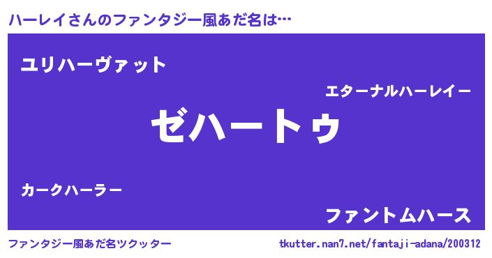 | ヒーロー風カッコイイあだ名 | 『最強戦士ハーレイ』『魔戒騎士ハー』 |