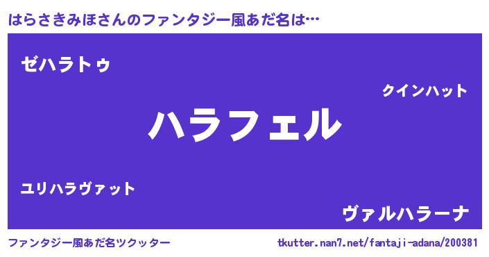 | 男性向けラノベタイトル風あだ名 | 『ハラサキミホアートオンライン』 |