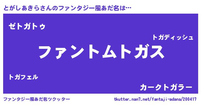| ポケモン風あだ名 | 『ヒトガシアキラ』『トガセウス』 |