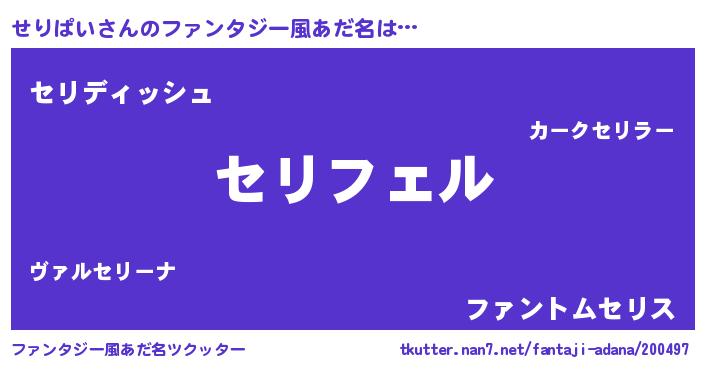 | ヘコむあだ名 | 『せりっふぃ~』『せりぱい(小並感)』 |